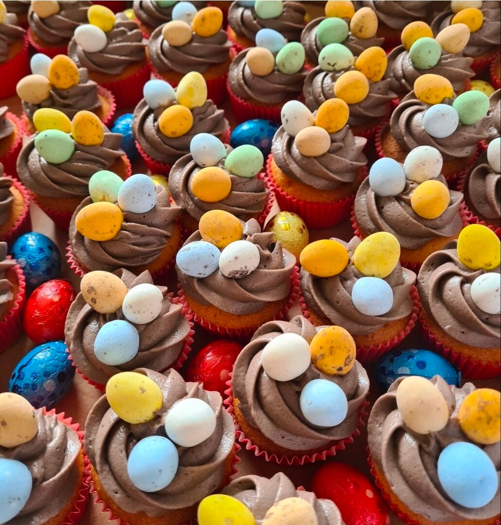 Cupcakes - Te bestelen per doosje van 4 stuks voor €8,00. Smaak naturel cake met een chocolade topping en versiering met chocolade dragee mini eitjes en fondant.